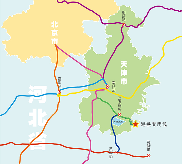 港鐵物流專用線接軌南港北站,通過南港鐵路與國家鐵路網(wǎng)進(jìn)行連接,在萬家碼頭與塑黃鐵路黃萬線連接,通過西南環(huán)線到達(dá)南倉站與京滬線、豐沙南線連接,同時(shí)在南倉站進(jìn)入津霸線從而連接到京九線及京廣線,在南倉站進(jìn)入津薊線從而連接到大秦線。